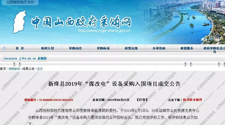 中標山西河津市經信局2018年“煤改電”項目設備采購及安裝項目兩個標段
