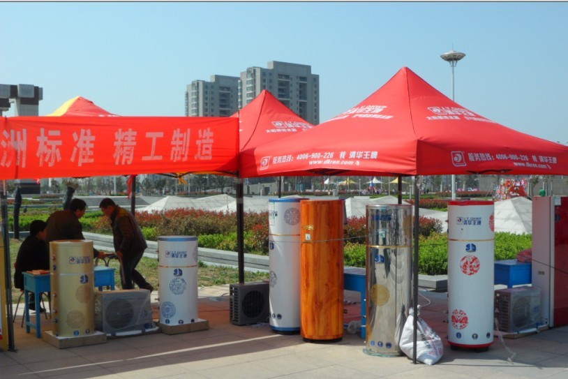 聚陽空氣能促銷現場圍觀的群眾,方型水箱,圓形水箱,應有盡有,眾多用戶在試用中。