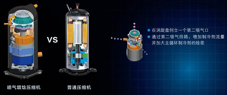 噴氣增焓技術(Enhanced Vapor Injection, EVI 技術),由壓縮機的引領者谷輪公司提出,并被廣泛運用到了谷輪公司的渦旋壓縮機上。相比于普通的壓縮機,加裝了噴氣增焓技術的渦輪壓縮機多一個噴射口,這樣可以將制冷劑進行二次壓縮。