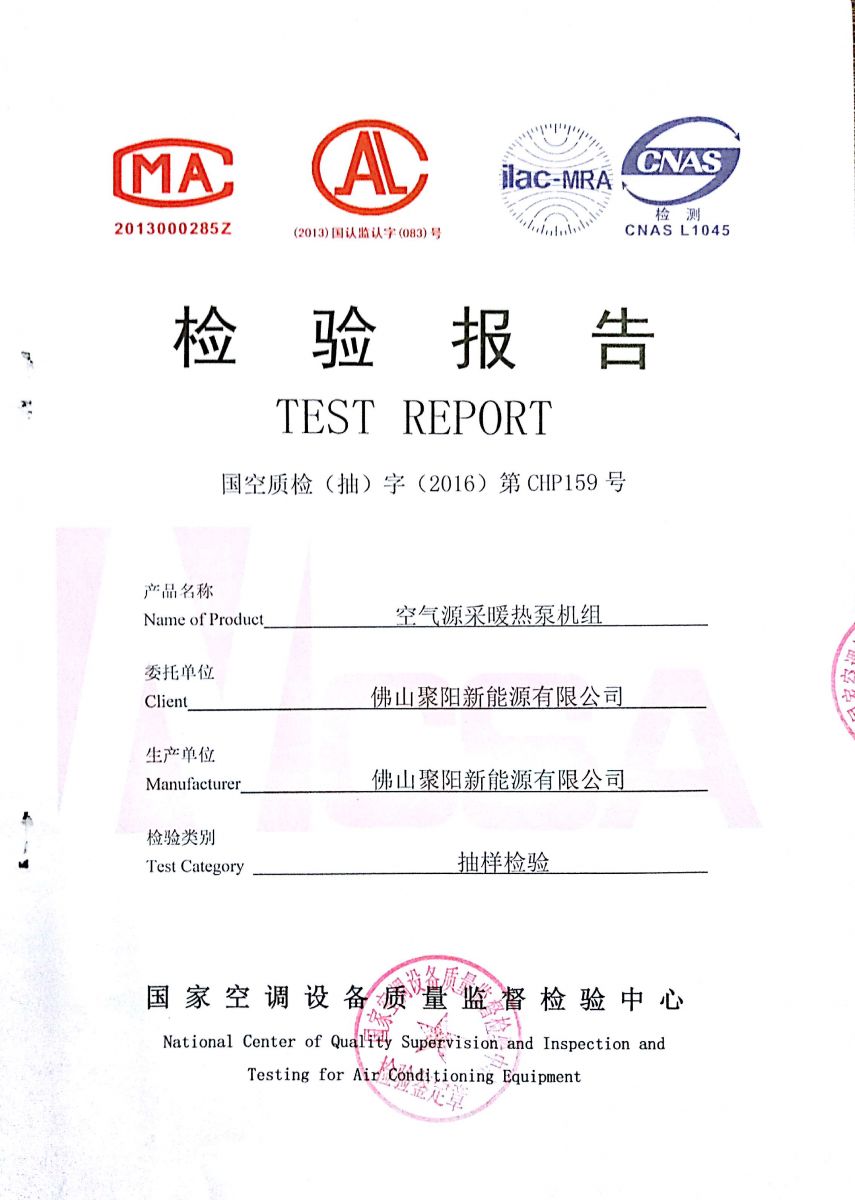 佛山聚陽新能源有限公司通過國家空調設備質量監督檢驗中心對空氣源采暖熱泵機組的抽樣檢驗,這為我們的空氣源采暖熱泵機組具有國家“煤改電”招標資格提供了一個有力的證明。