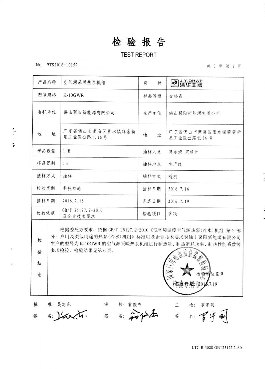佛山聚陽新能源有限公司通過國家日用電器質量監督檢驗中心對空氣源采暖熱泵機組的委托檢驗,這為我們的空氣源采暖熱泵機組具有國家“煤改電”招標資格提供了一個有力的證明。